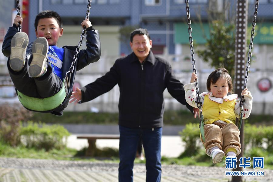 陜西寧強縣大安鎮(zhèn)江林安置點的居民帶著孫子、孫女在安置點廣場上蕩秋千(3月13日攝)。新華社記者邵瑞攝