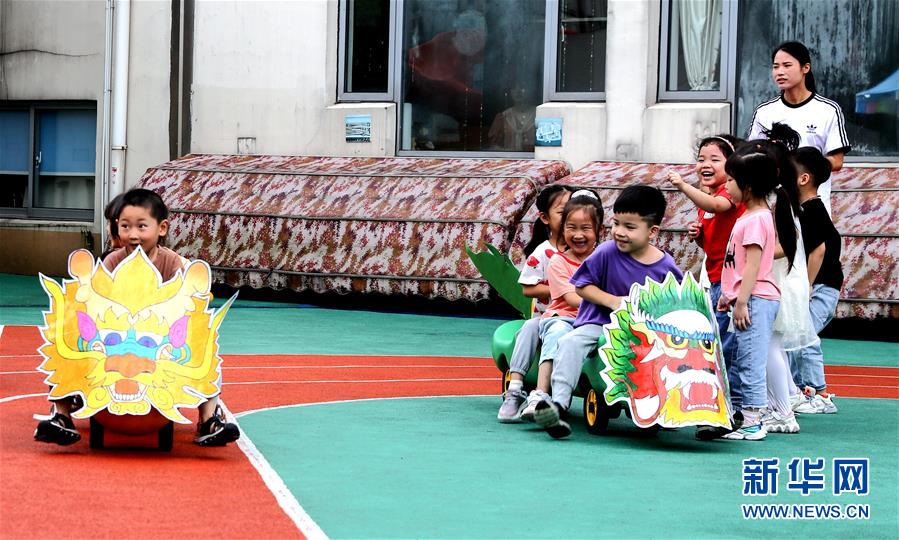 6月23日,長興縣李家巷鎮(zhèn)中心幼兒園的孩子們一起在玩自創(chuàng)“劃龍舟”游戲。為了迎接即將到來的端午節(jié),浙江省湖州市長興縣各個幼兒園開展“品民俗迎端午”主題活動,讓小朋友們體驗傳統(tǒng)民俗文化。新華社記者徐昱攝