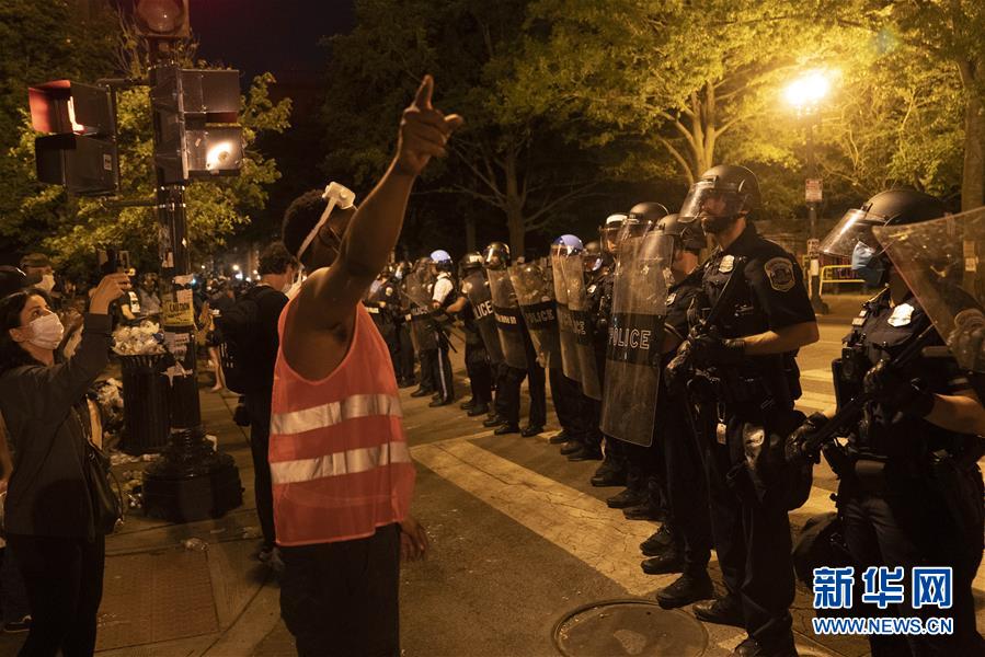 6月22日,警察和示威者在美國華盛頓白宮附近對(duì)峙。美國警察和示威者22日晚在首都華盛頓市白宮北側(cè)拉斐特廣場發(fā)生沖突并對(duì)峙。美國總統(tǒng)特朗普在社交媒體上說,許多人因破壞廣場上美國前總統(tǒng)安德魯·杰克遜的雕像及附近圣約翰圣公會(huì)教堂被逮捕。新華社記者劉杰攝