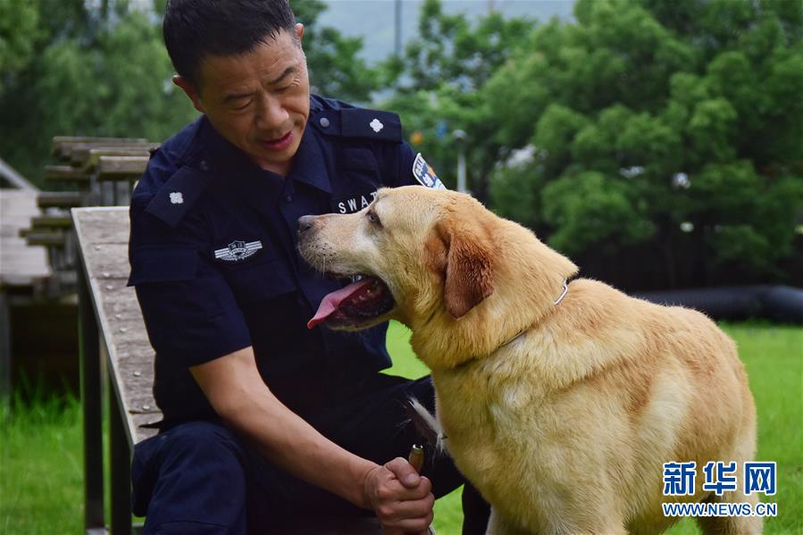 6月24日,緝毒犬“多多”完成訓(xùn)練后,與訓(xùn)導(dǎo)員周吉榮親密互動(dòng)。 新華社記者 鄭夢(mèng)雨 攝