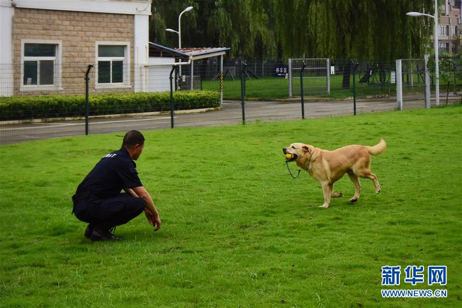 6月24日,訓(xùn)導(dǎo)員周吉榮和緝毒犬“多多”在訓(xùn)練場上互動。 新華社記者 鄭夢雨 攝