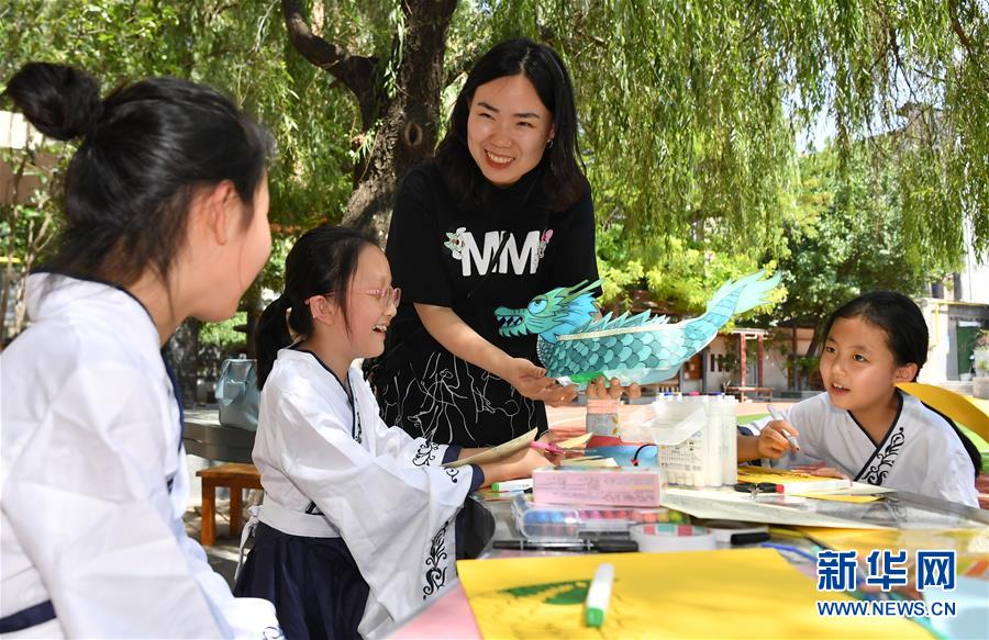 6月24日,西安市新城區(qū)后宰門小學的老師指導學生制作紙質(zhì)龍舟模型。端午節(jié)臨近,各地舉行包粽子、做香包、賽龍舟等豐富多彩的民俗文化活動,迎接傳統(tǒng)佳節(jié)的到來。新華社記者劉瀟攝