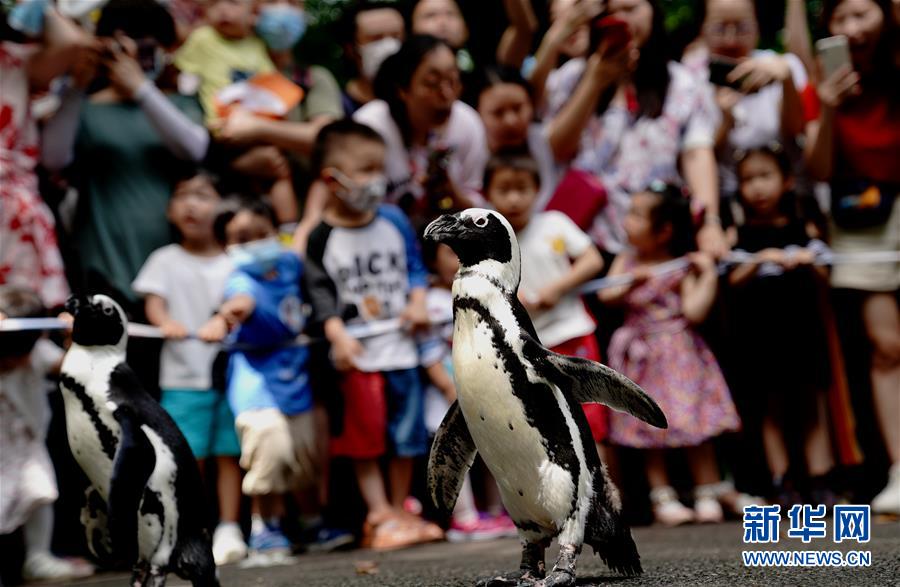 6月26日,上海動物園的企鵝在游客面前漫步。新華社記者 張建松 攝
