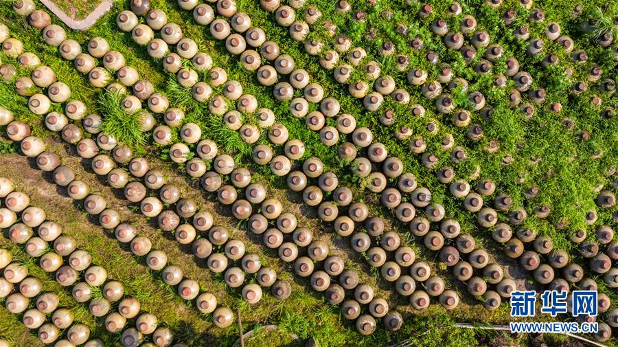 赤水曾氏曬醋廠晾曬的醋壇(6月26日攝,無(wú)人機(jī)照片)?!俺嗨畷翊住辈捎霉腆w發(fā)酵繁殖產(chǎn)生天然醋酸菌,醋醅和成品醋都在日光下曝曬而成,故稱(chēng)曬醋?!俺嗨畷翊住敝谱鳉v史悠久,工序考究,2009年被列入貴州省級(jí)非遺名錄。新華社記者 陶亮 攝