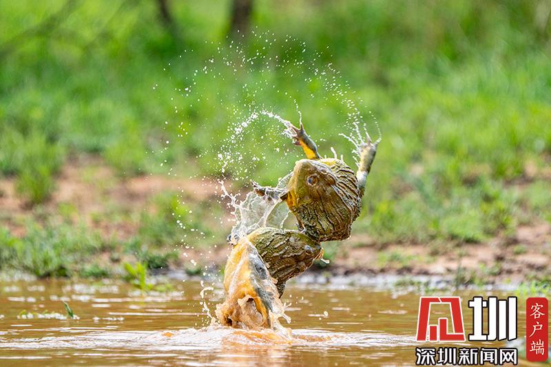 2020年6月30日?qǐng)?bào)道(具體拍攝時(shí)間不詳),南非波羅克瓦克,兩只雄性非洲牛蛙為了爭(zhēng)奪雌性牛蛙,在池塘中打架,這樣的情形十分罕見。畫面中,戰(zhàn)況十分激烈,一只非洲牛蛙在另外一只試圖逃到池塘邊緣時(shí)撕咬對(duì)手,甚至將另外一只拋向空中。這些精彩的照片是由南非開普敦?cái)z影師Temujin Johnson拍攝的。