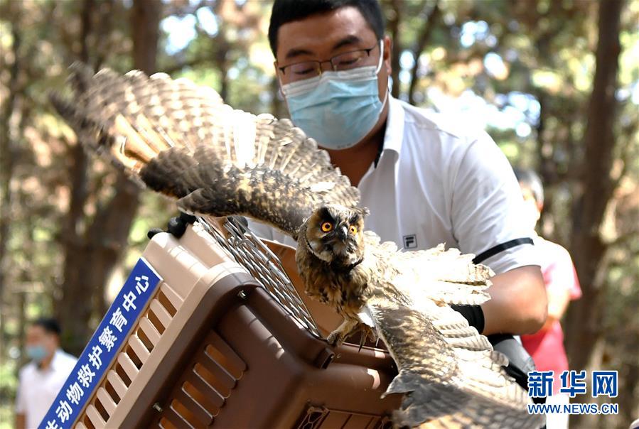 7月1日,吉林省野生動物救護繁育中心工作人員放飛一只長耳鸮。當日,吉林省東北虎園舉行放飛活動,吉林省野生動物救護繁育中心救護的40只珍稀野生鳥類成功放歸自然。新華社記者林宏攝