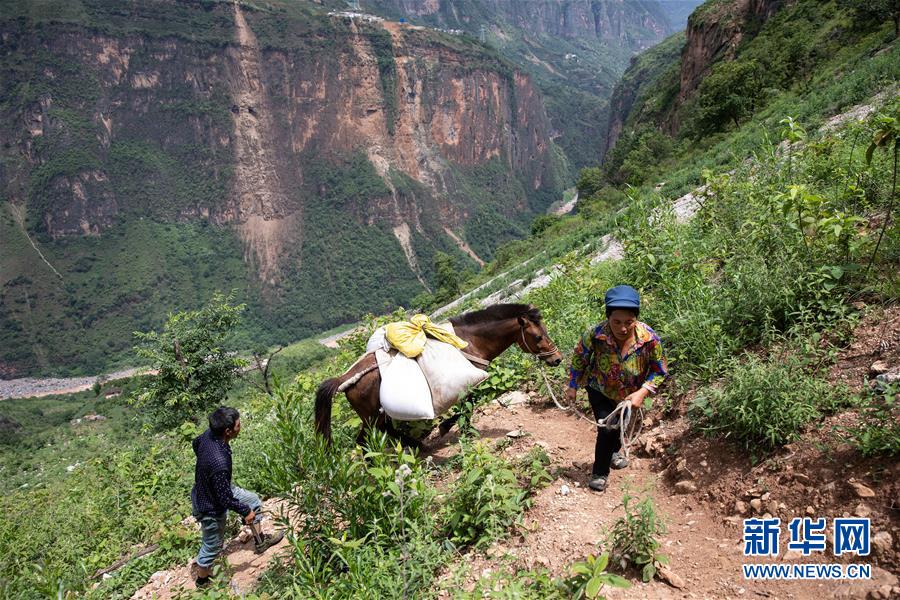 且沙次干、阿達(dá)么日雜夫婦倆趕著馬,馱著糧食、家什,準(zhǔn)備搬進(jìn)村集中安置點(diǎn)的新居(6月27日攝)。新華社記者 江宏景 攝