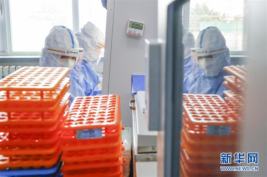 7月3日,中日友好醫(yī)院檢驗(yàn)科新冠核酸檢測實(shí)驗(yàn)室的檢驗(yàn)人員閆克芹和張鑫(左)在實(shí)驗(yàn)室內(nèi)處理剛剛送到的樣本。新華社記者張玉薇攝