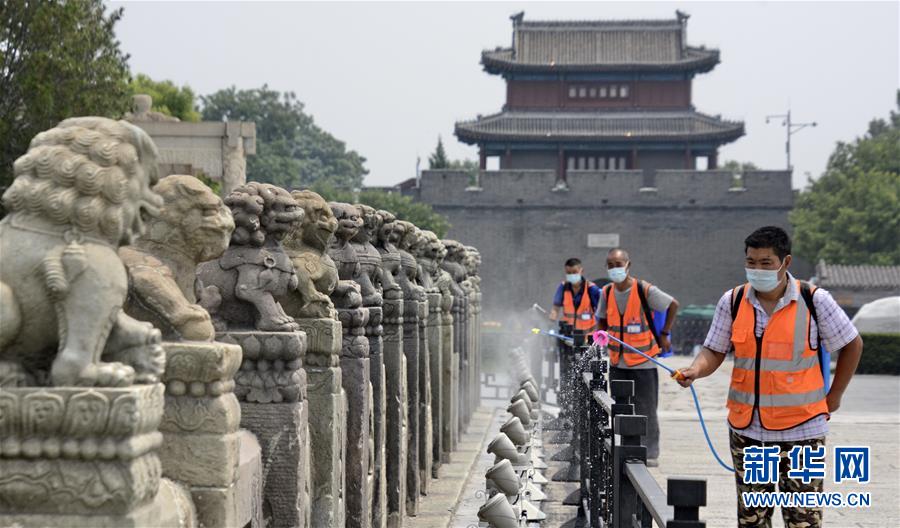 7月4日,防疫人員在盧溝橋景區(qū)進(jìn)行環(huán)境消毒。當(dāng)日,北京市豐臺區(qū)組織防疫人員、安全監(jiān)察部門人員對社區(qū)、超市、公共場所進(jìn)行大規(guī)模環(huán)境消毒及疫情隱患排查,全力保障市民生活和工作環(huán)境安全。新華社記者 李欣 攝