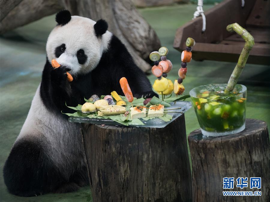 7月6日,在臺北市立動(dòng)物園,大熊貓“圓仔”正在品嘗特制的生日蛋糕。新華社記者金立旺攝