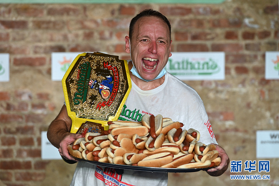 7月4日,美國(guó)紐約布魯克林舉行一年一度的國(guó)際吃熱狗比賽,喬伊·切斯納特以吃75個(gè)熱狗的成績(jī)贏得男子賽區(qū)冠軍,創(chuàng)下了新的世界紀(jì)錄。(圖片來源:視覺中國(guó))