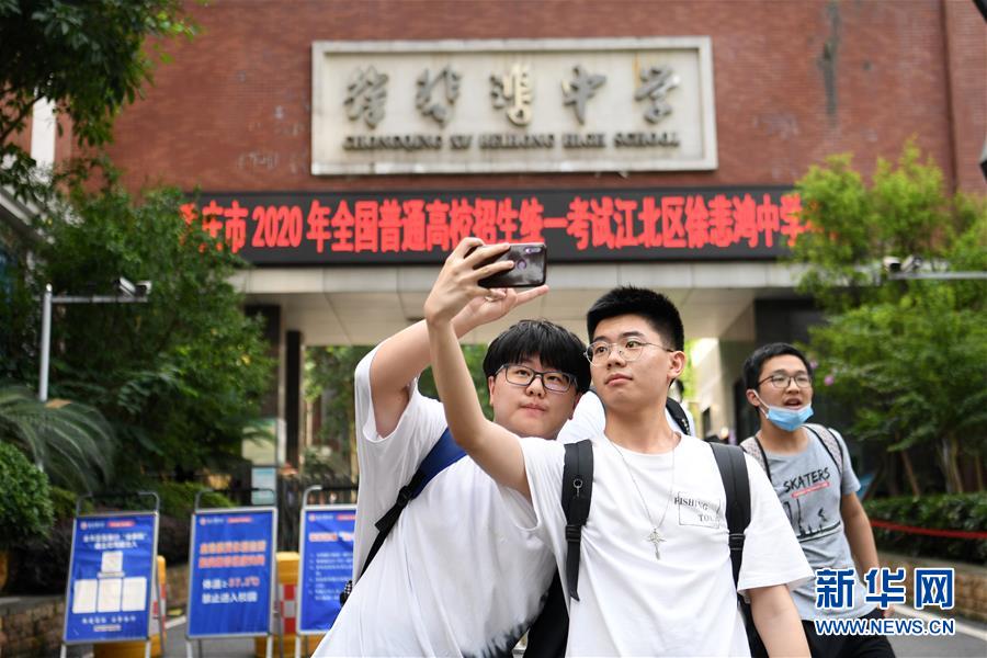 7月8日,在重慶市徐悲鴻中學(xué)考點(diǎn),考生在考試結(jié)束后在校門口合影。當(dāng)日,全國(guó)部分地區(qū)2020年高考結(jié)束。新華社記者唐奕攝