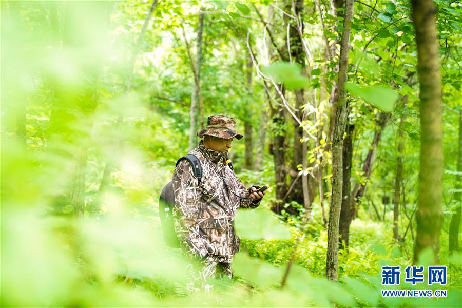 董紅雨在迎春林業(yè)局有限公司施業(yè)區(qū)內進行野生東北虎蹤跡信息搜集和巡護工作(7月8日攝)。新華社記者李建平攝