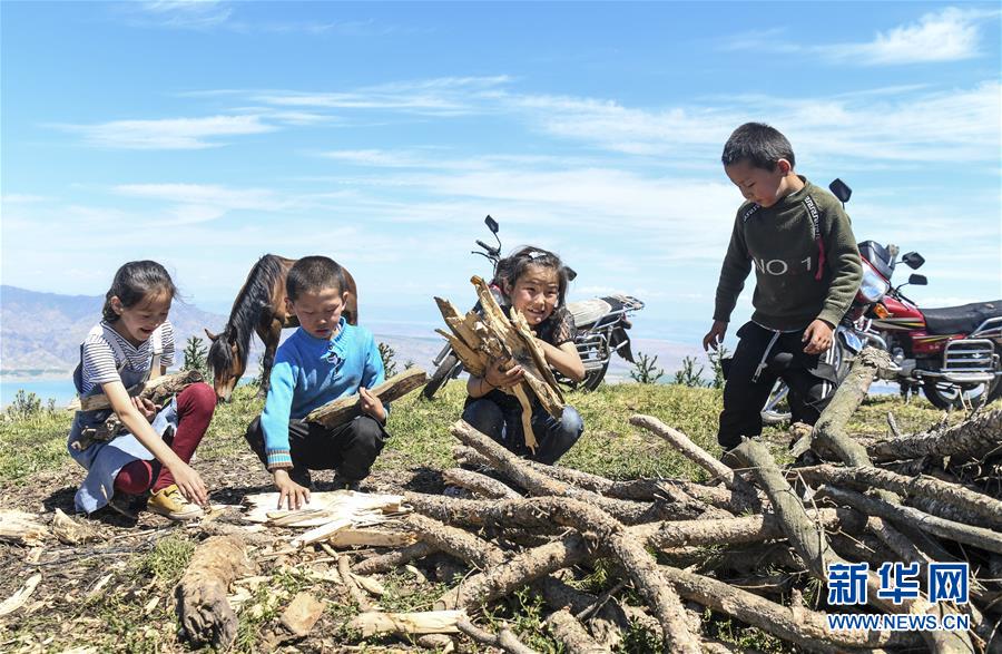 在新疆特克斯縣境內(nèi)的夏牧場里,小朋友在幫家人拾柴(7月2日攝)。新華社記者王菲攝