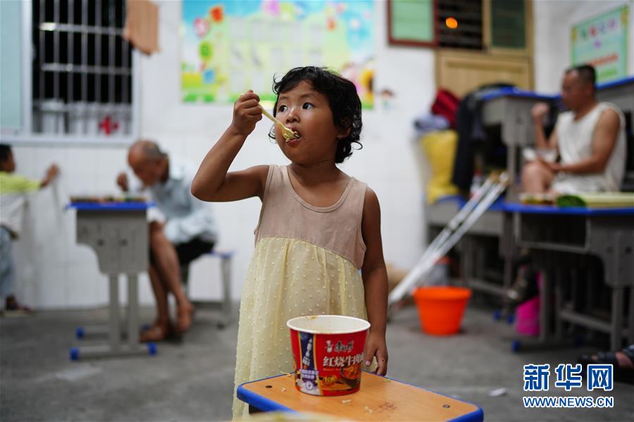7月9日,小朋友在安置點里吃飯。當(dāng)日,江西鄱陽縣鄱陽鎮(zhèn)因洪水受災(zāi)的村民被轉(zhuǎn)移到多個集中安置點。在鄱陽縣五一中心學(xué)校安置點,志愿者和工作人員接到任務(wù)后不到十小時內(nèi),為被轉(zhuǎn)移村民布置了28間教室,供519人安頓,并為村民發(fā)放褥子、床單、枕頭、盒飯、飲用水等物資。新華社記者周密攝