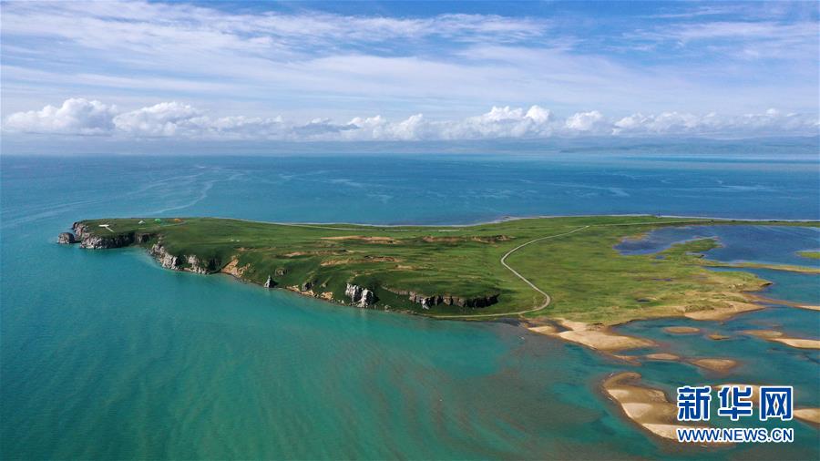 7月10日拍攝的青海湖風(fēng)光(無(wú)人機(jī)照片)。盛夏時(shí)節(jié),被譽(yù)為“中國(guó)最美湖泊”的青海湖畔景色宜人,藍(lán)天、白云、湖水與草原組成一幅壯美的畫(huà)卷。新華社記者張宏祥攝