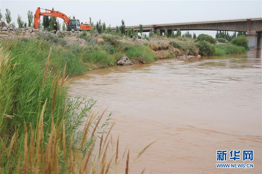 7月11日,工人在黃河內蒙古磴口段南套子險工段進行除險加固。新華社記者李云平攝