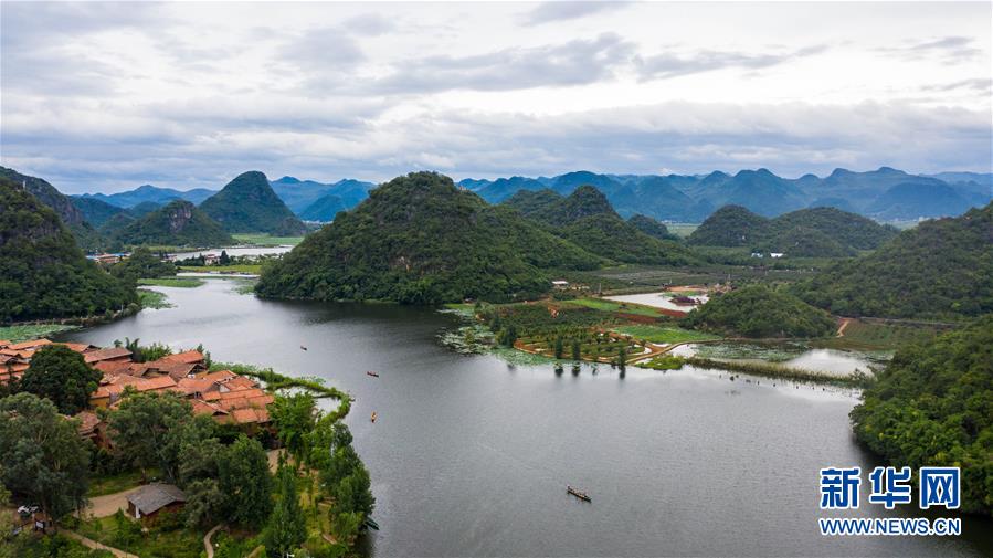 游人在普者黑國家濕地公園泛舟賞景(7月10日攝,無人機照片)。新華社記者胡超攝