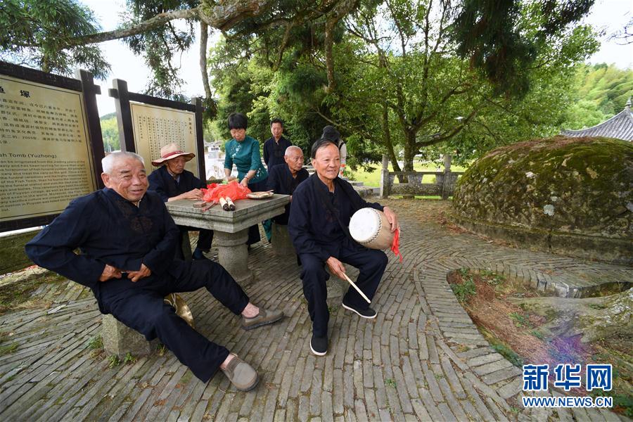 7月4日,幾名參加魚祭習(xí)俗展示的浦源村民在樹蔭下休息。魚祭習(xí)俗是為死去的鯉魚舉行送葬儀式,是浦源村特有的習(xí)俗。新華社記者 姜克紅 攝
