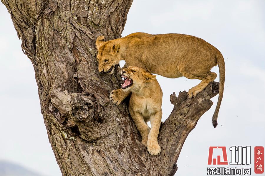 2020年7月13日報道(具體拍攝時間不詳),Sandesh Kadur是一名印度野生動物攝影師,他在坦桑尼亞塞倫蓋蒂國家公園拍攝到一系列“獅子上樹”的精彩照片。畫面中,有一只憤怒的母獅為了捍衛(wèi)自己在樹上的位置,一邊劈叉一邊對著鏡頭咆哮,有兩只獅子為了爭奪位置互相攻擊,還有一只獅子在找到舒適的位置后呼呼大睡。