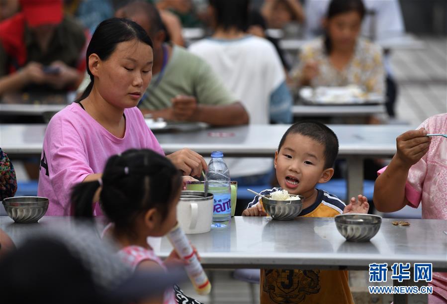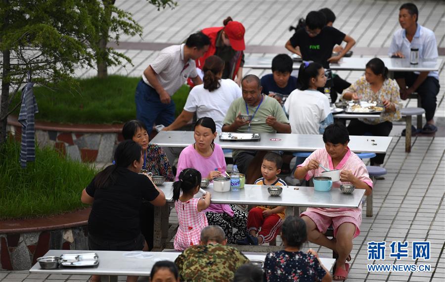 7月14日,在宿松縣洲頭鄉(xiāng)中心小學(xué)集中安置點(diǎn),洲頭鄉(xiāng)泗洲村的村民在吃晚餐。近日,安徽省宿松縣洲頭鄉(xiāng)泗洲村的300多名村民因洪水被轉(zhuǎn)移到該鄉(xiāng)中心小學(xué)集中安置點(diǎn)。安置點(diǎn)工作人員、志愿者利用學(xué)校食堂為村民們烹飪飯菜,讓村民們?cè)诎仓命c(diǎn)吃上熱騰騰的三餐。新華社記者 劉軍喜 攝