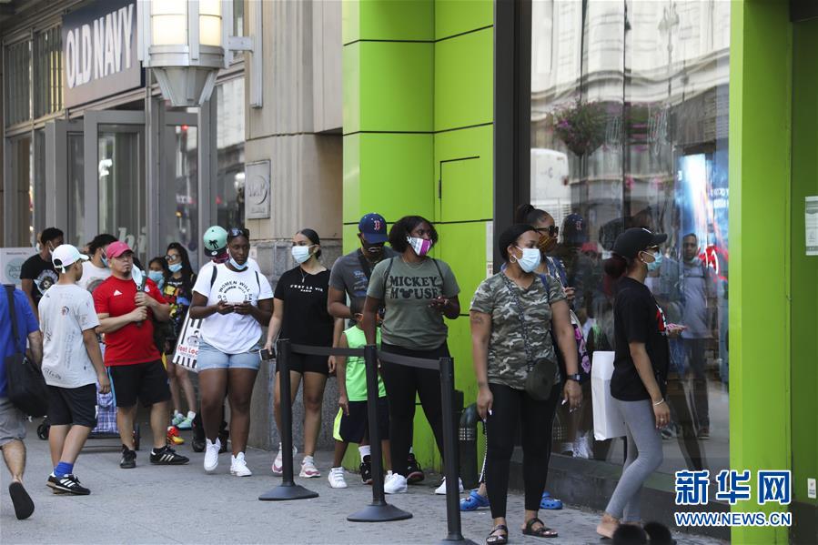 7月14日,人們在美國紐約排隊(duì)等待進(jìn)店購物。美國約翰斯·霍普金斯大學(xué):截至北京時(shí)間15日6時(shí)34分,全球新冠確診病例達(dá)13258016例,死亡病例為576752例。美國是全球疫情最嚴(yán)重的國家,確診病例達(dá)3416222例,死亡病例為136319例。新華社記者 王迎 攝