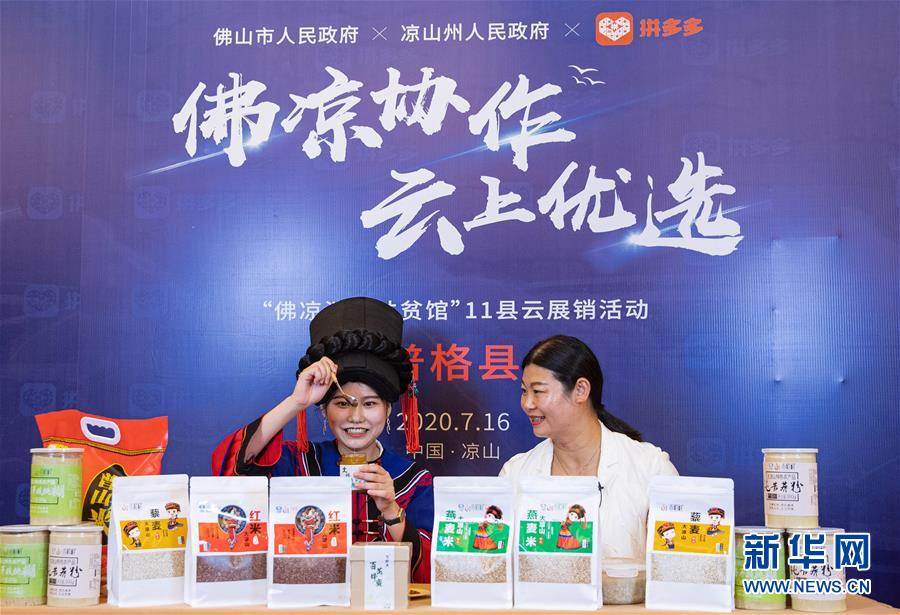 7月18日,在涼山州昭覺縣粵川東西部扶貧協(xié)作項(xiàng)目產(chǎn)業(yè)園,昭覺縣縣長(zhǎng)赫紹洪(右)在直播活動(dòng)中向網(wǎng)友推薦農(nóng)特產(chǎn)品。新華社記者江宏景攝