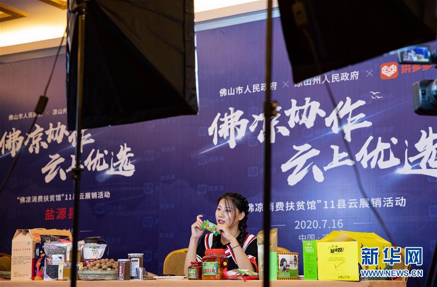 7月16日,直播主持人在電商直播間推介涼山農(nóng)特產(chǎn)品。新華社記者江宏景攝