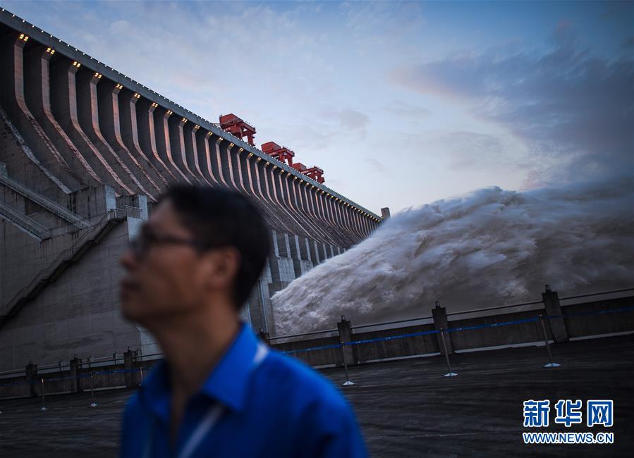 7月19日,工作人員在三峽樞紐前巡查。19日20時,三峽水庫入庫流量4.6萬立方米/秒,較本輪洪水的峰值6.1萬立方米/秒下降了1.5萬立方米/秒?!伴L江2020年第2號洪水”平穩(wěn)通過三峽大壩。新華社記者肖藝九攝