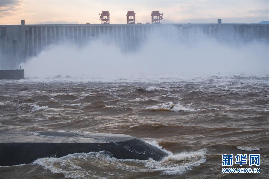 7月19日,三峽樞紐開啟泄洪深孔泄洪。19日20時(shí),三峽水庫(kù)入庫(kù)流量4.6萬立方米/秒,較本輪洪水的峰值6.1萬立方米/秒下降了1.5萬立方米/秒?!伴L(zhǎng)江2020年第2號(hào)洪水”平穩(wěn)通過三峽大壩。新華社記者肖藝九攝