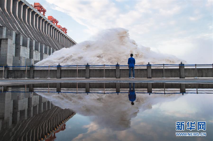 7月19日,工作人員在三峽樞紐前巡查。19日20時,三峽水庫入庫流量4.6萬立方米/秒,較本輪洪水的峰值6.1萬立方米/秒下降了1.5萬立方米/秒?!伴L江2020年第2號洪水”平穩(wěn)通過三峽大壩。新華社記者肖藝九攝