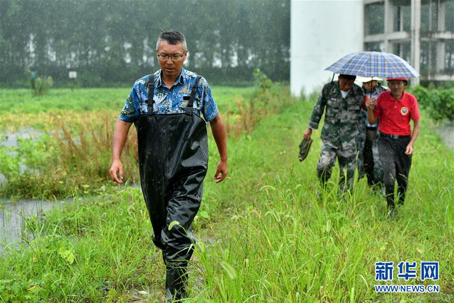 劉良武與巡查人員在堤壩內(nèi)側(cè)排查險(xiǎn)情(7月19日攝)。新華社記者李鑫攝