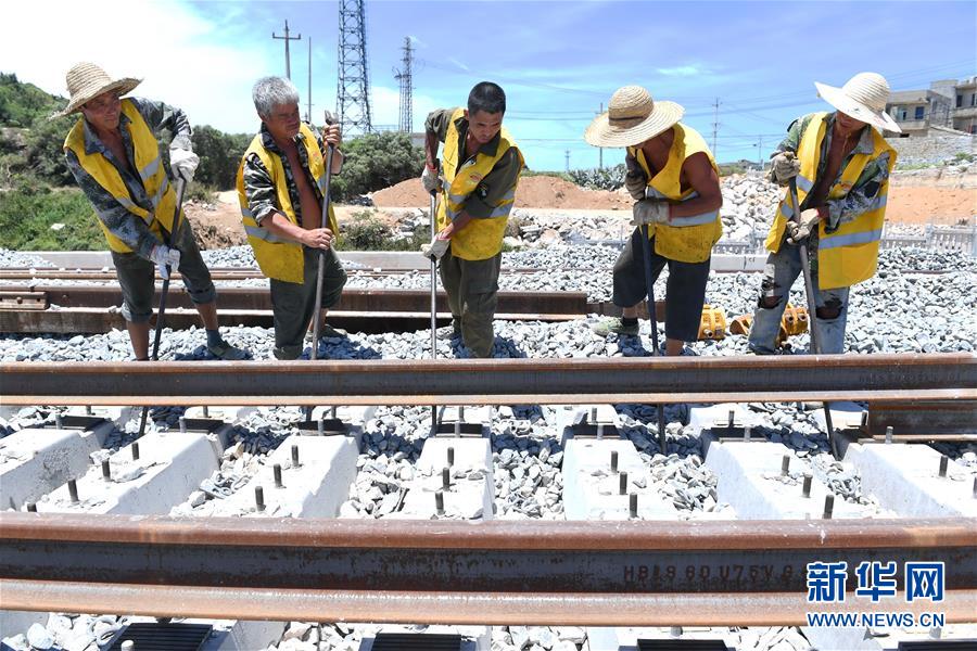 7月20日,中鐵二十四局施工人員進行平潭海峽公鐵大橋最后一根500米長軌的換鋪工作。當日,中鐵二十四局施工人員在平潭海峽公鐵大橋進行最后一根鐵路長軌換鋪。至此,平潭海峽公鐵大橋雙線鐵路長軌全部換鋪完成。新華社記者林善傳攝