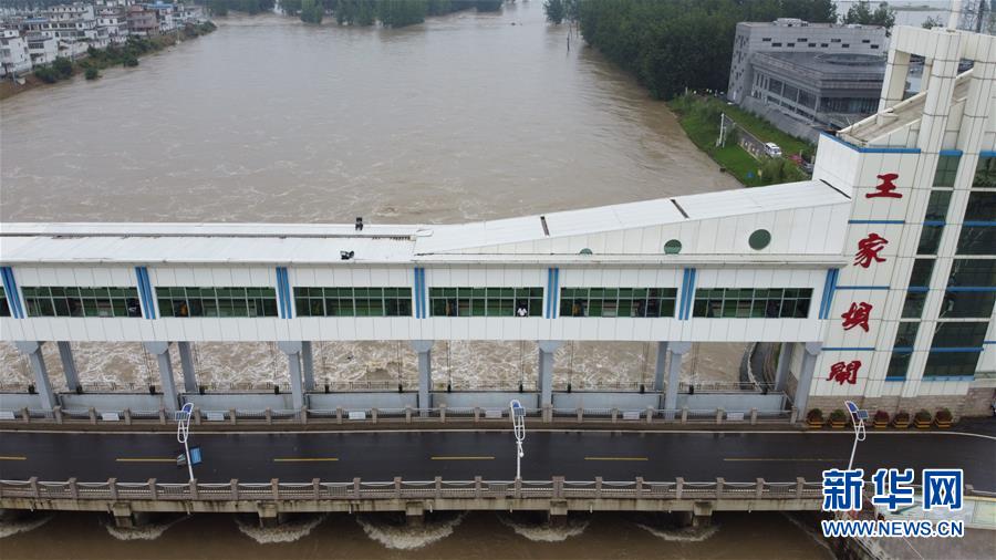 這是7月22日在安徽省阜南縣拍攝的淮河王家壩閘(無人機照片)。7月22日14時,淮河王家壩水位降至28.73米,超警戒水位1.23米,低于保證水位0.57米。新華社記者張端攝