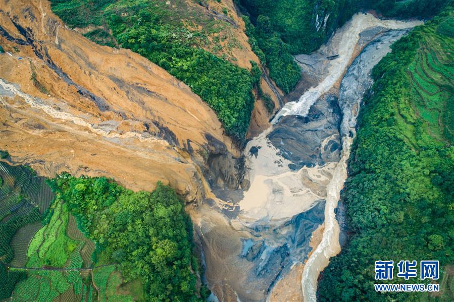 7月22日拍攝的因恩施州屯堡鄉(xiāng)馬者村山體滑坡形成的堰塞湖(無人機照片)。新華社記者肖藝九攝