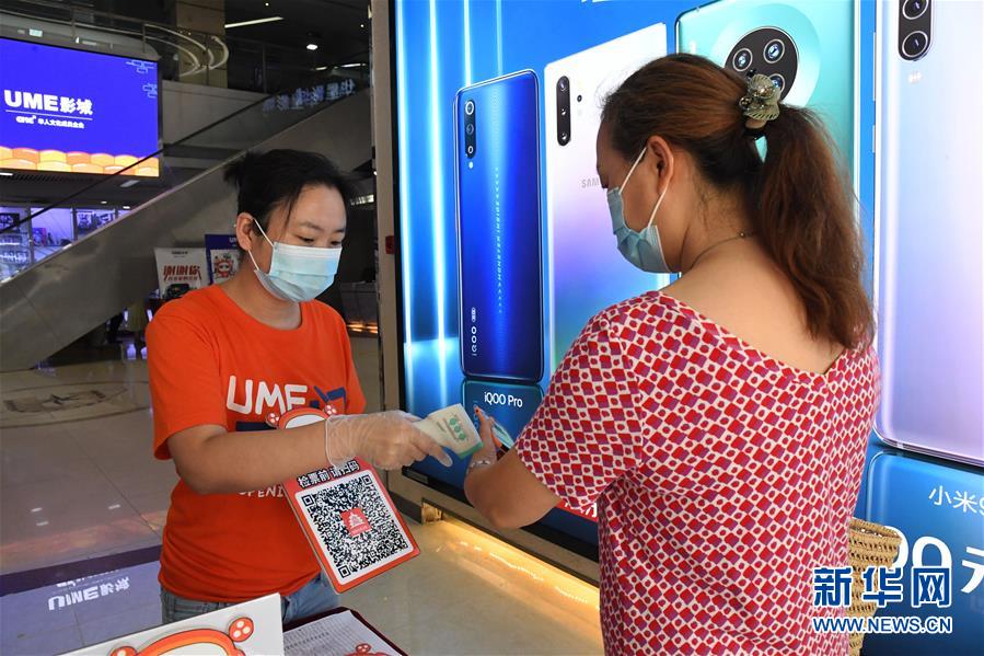 7月24日,在UME影城北京華星店,工作人員(左)為觀眾測量體溫。當(dāng)日,在做好新冠肺炎疫情防控的前提下,北京市部分電影院有序恢復(fù)開放。新華社記者 任超 攝