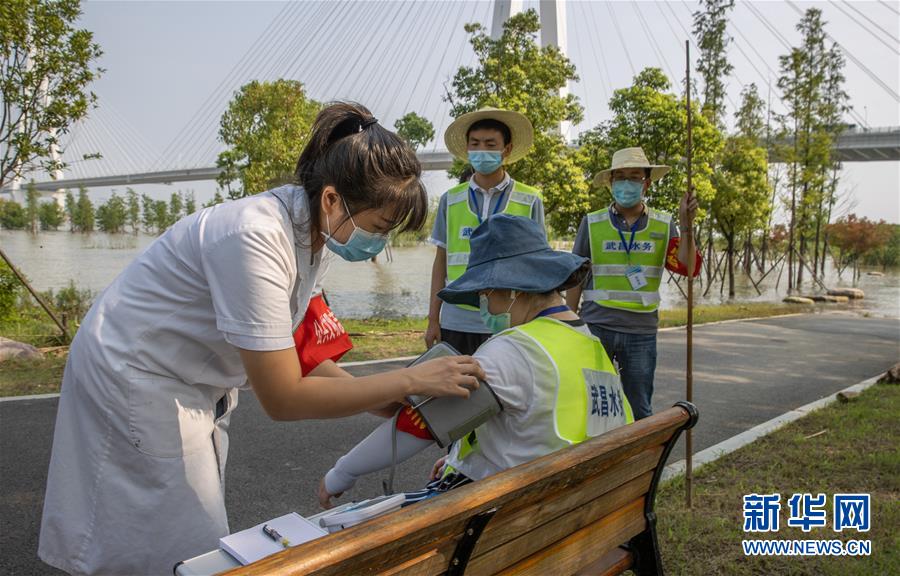 7月24日,在武漢青山江灘羅家港防汛值守哨棚旁,武昌區(qū)楊園街社區(qū)衛(wèi)生服務(wù)中心醫(yī)務(wù)人員為巡堤員測(cè)量血壓和心率。從7月6日開(kāi)始,該中心醫(yī)務(wù)人員攜帶醫(yī)藥箱和消毒器具每天兩次往返于3.7公里的長(zhǎng)江岸堤,為巡堤員測(cè)量血壓、監(jiān)測(cè)體溫,并宣傳防疫知識(shí)。新華社記者 肖藝九 攝