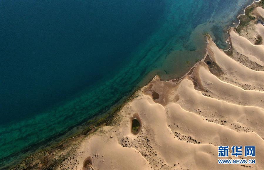 這是青海湖沙島一角(7月28日攝,無人機照片)。盛夏傍晚,位于青海湖東北部的沙島,島內(nèi)湖泊星羅棋布,沙丘連綿起伏,風景別致。金沙與湖水掩映,在陽光的勾勒下形成一幅美麗的畫卷。新華社記者張宏祥攝