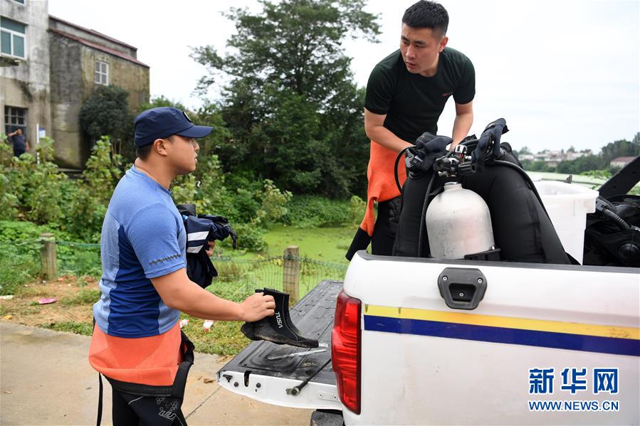 7月24日,徐宏林(左)和吳正寶在安徽省廬江縣臺創(chuàng)園小南河段準(zhǔn)備潛水裝備。新華社記者劉軍喜攝