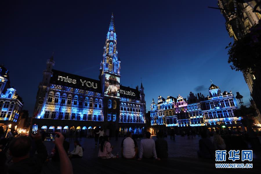 7月29日,人們在比利時布魯塞爾大廣場欣賞聲光秀,市政廳外墻上投射出“想念你,音樂”的字樣。7月29日,比利時布魯塞爾大廣場舉行大型聲光秀。藝術(shù)家在市政廳等歷史建筑上投影文字和圖案,紀(jì)念這個夏天受新冠疫情影響而不能如期舉辦的文化活動。新華社記者鄭煥松攝