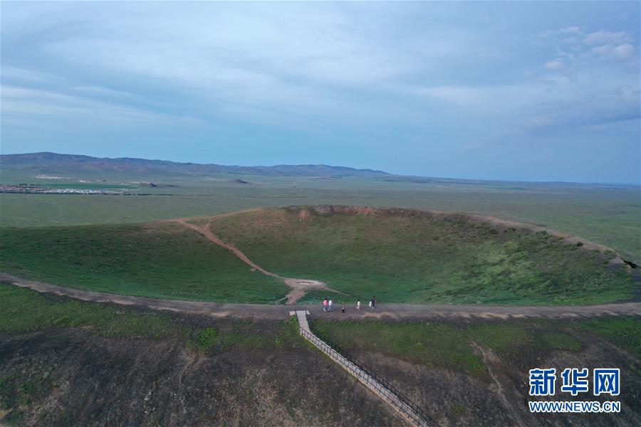 7月29日,游客在烏蘭哈達(dá)火山群的一處火山口游玩(無(wú)人機(jī)照片)。新華社記者劉磊攝