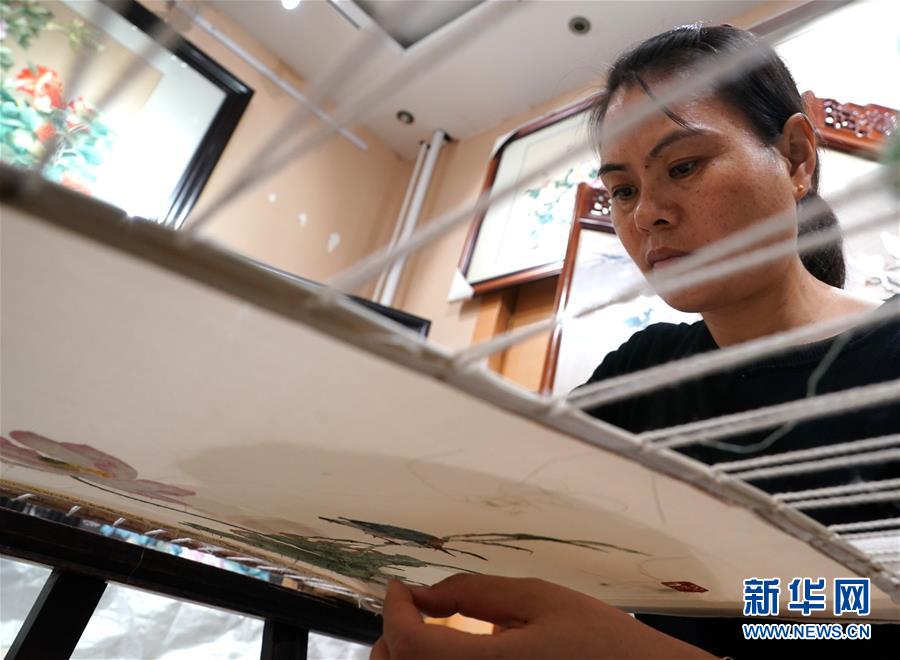 在開封市素花宋繡工藝有限公司的展示館里,王素花在刺繡(7月30日攝)。新華社記者李嘉南攝