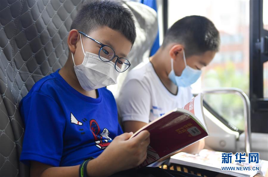 8月5日,小讀者在“流動(dòng)圖書館”里看書。三千冊(cè)圖書,一輛大巴車,穿梭在城市的街頭巷尾。在吉林長(zhǎng)春,長(zhǎng)春市圖書館利用流動(dòng)圖書車,定期在市內(nèi)15個(gè)固定服務(wù)點(diǎn)間巡回流動(dòng),為市民提供便捷的圖書借閱服務(wù)。新華社記者許暢攝