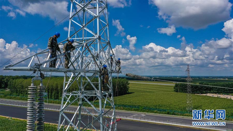 8月6日,幾名送電工在吉林省長(zhǎng)春市城郊的一處輸電鐵塔上施工作業(yè)(無(wú)人機(jī)照片)。吉林省長(zhǎng)春市連續(xù)多日出現(xiàn)高溫天氣,國(guó)網(wǎng)長(zhǎng)春供電公司輸電運(yùn)檢中心的送電工們每天清晨開(kāi)始作業(yè),不畏烈日“烤”驗(yàn),堅(jiān)守工作崗位,確保工程按計(jì)劃完成。新華社記者張楠攝