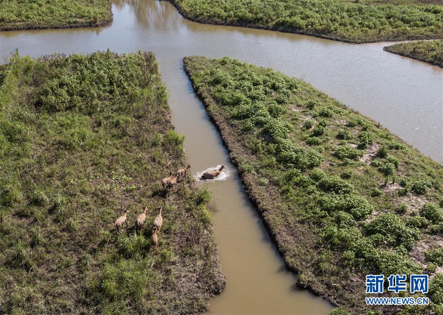 這是8月7日在東洞庭湖麋鹿和鳥類救治避難中心拍攝的麋鹿(無人機(jī)照片)。位于湖南省岳陽市的東洞庭湖麋鹿和鳥類救治避難中心成立于2016年9月,占地400余畝,中心自建成后就承擔(dān)起東洞庭湖區(qū)域全部麋鹿的救援、醫(yī)治、康復(fù)和喂養(yǎng)任務(wù)。目前該中心共有14只麋鹿正在接受救助。新華社記者李鑫攝