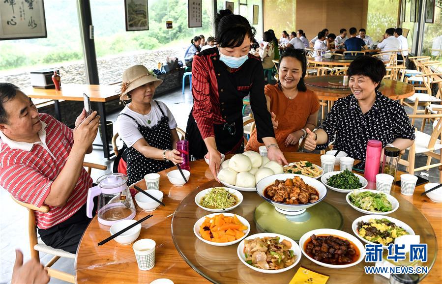 游客在陜西寶雞市太白縣咀頭鎮(zhèn)白云村的一家農(nóng)家樂里就餐(7月5日攝)。白云村是秦嶺深處的小山村,2016年建檔立卡貧困戶303人。近年來,為了徹底改變貧困面貌,白云村依靠當(dāng)?shù)匾郎桨牡赜騼?yōu)勢(shì),全面提升人居環(huán)境和村容村貌,發(fā)展鄉(xiāng)村旅游,讓群眾持續(xù)增收。目前,白云村已實(shí)現(xiàn)整體脫貧,2019年全村人均純收入12880元。新華社記者劉瀟攝。