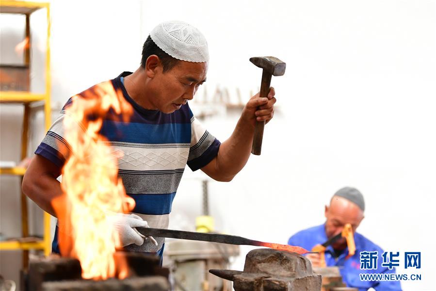8月10日,甘肅省臨夏回族自治州積石山縣大河家鎮(zhèn)的村民馬維正在制作保安腰刀。新華社記者陳斌攝。