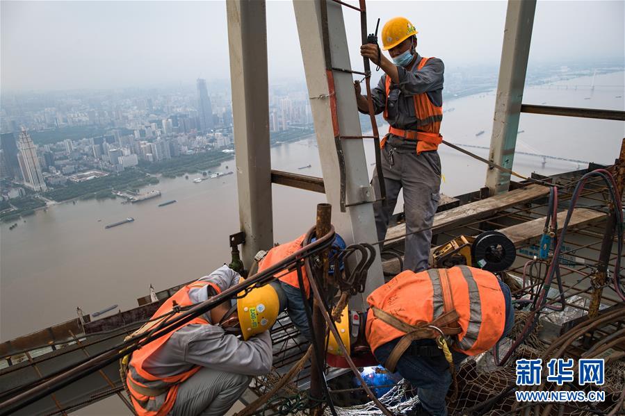 8月11日,工人在武漢綠地中心項目建設現(xiàn)場近500米的高空施工。新華社記者肖藝九攝