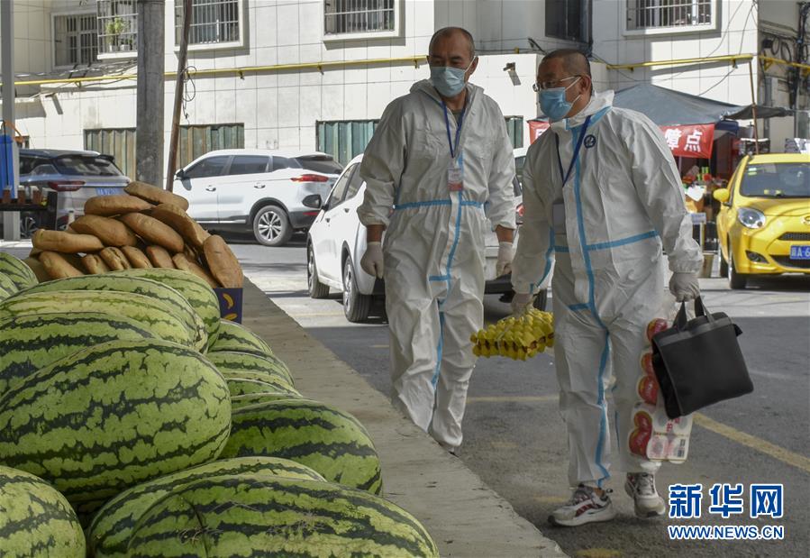 8月12日,烏魯木齊市天山區(qū)山西巷社區(qū)工作人員王志鷹(右)在社區(qū)物資保障點前詢問水果銷售情況。新華社記者 高晗攝