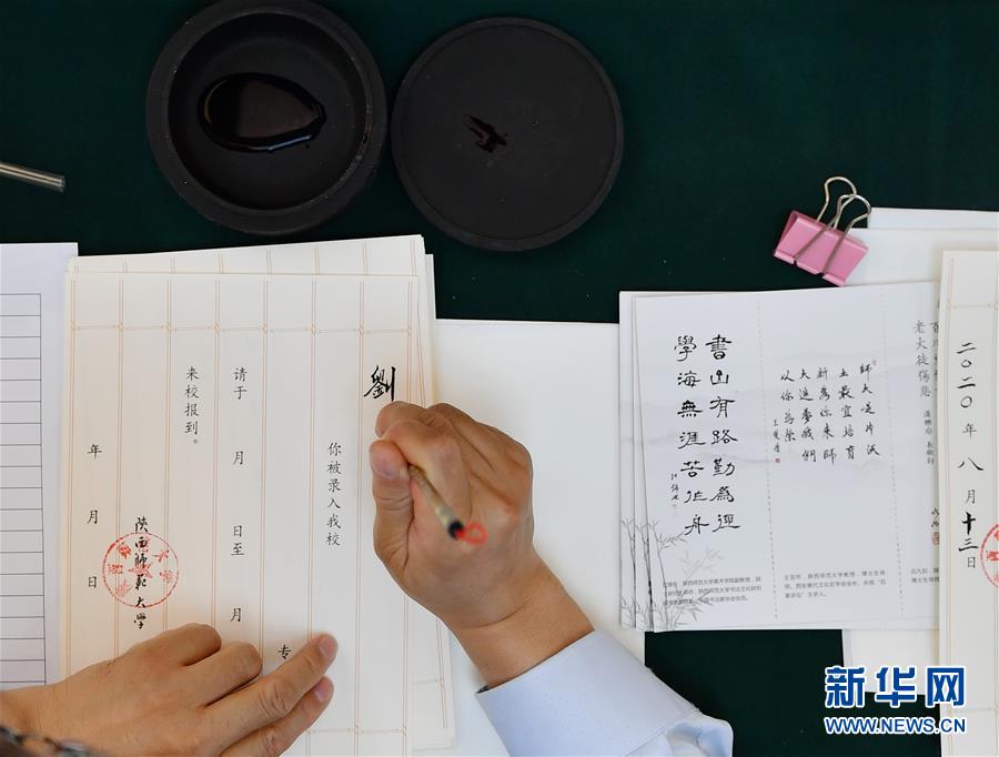 8月13日,陜西師范大學(xué)在職教師王雙懷書寫錄取通知書。當日,陜西師范大學(xué)2020年手寫錄取通知書正式開筆。該校自2007年起采用毛筆書寫錄取通知書的方式,為新生傳遞佳音。今年,學(xué)校十余位退休教師、在職教師、校友代表等書法愛好者將為約4500名新錄取的本科生送上帶著墨香的大學(xué)錄取通知書。新華社記者張博文攝